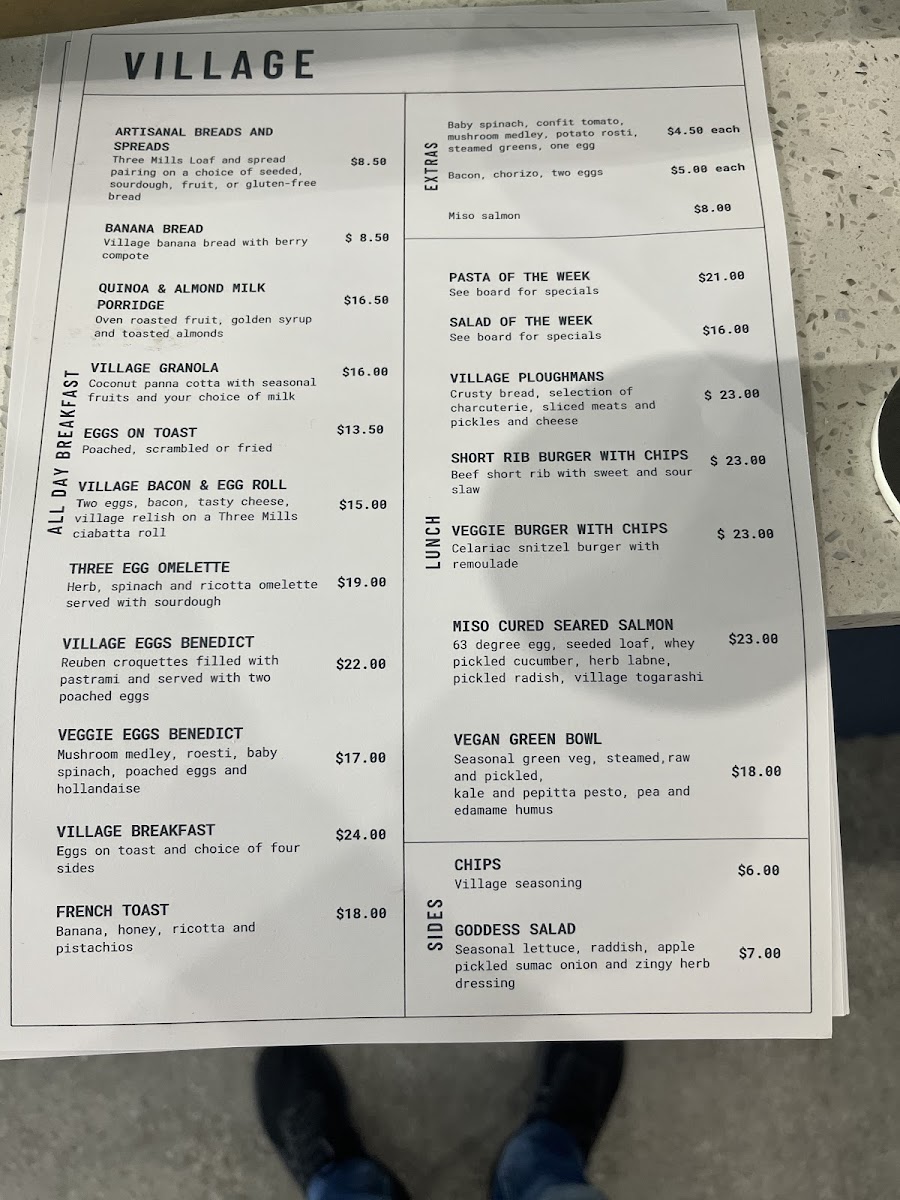 The menu at Village Cafe and Dining Waramanga offers a variety of options suitable for breakfast, lunch, and casual dining throughout the day. It is organized into several key sections to accommodate different preferences and meal times.